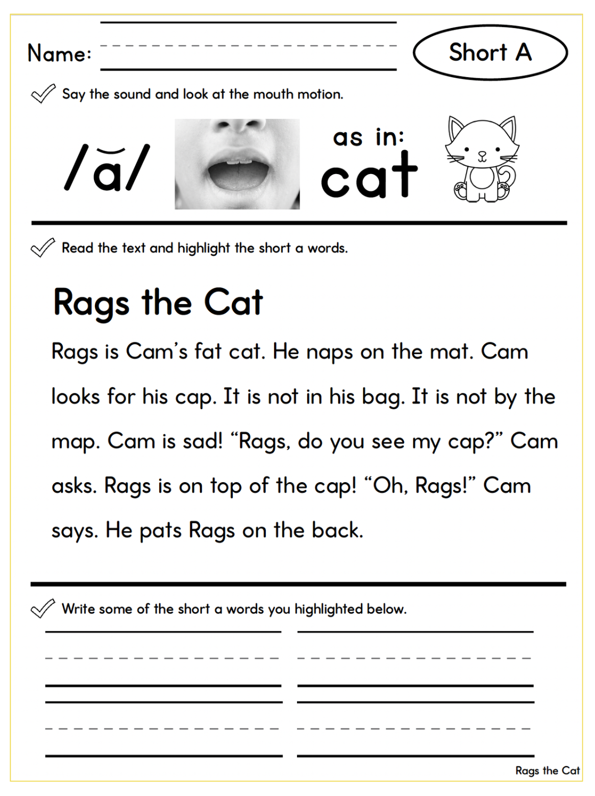 For example, if the passage focuses on the short a sound, students first say the sound and connect it to a keyword such as short a as in cat.